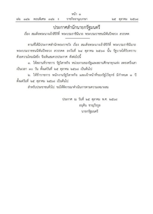 ๑๔. ประกาศสำนักนายกรัฐมนตรี แนวทางไว้ทุกข์ “สมเด็จพระพันปีหลวง” รัฐ-ประชาชน ลดธงครึ่งเสา ๓๐ วัน ให้ข้าราชการ พนักงานรัฐวิสาหกิจ และเจ้าหน้าที่ของรัฐไว้ทุกข์ มีกำหนด ๑ ปี ตั้งแต่วันที่ ๒๕ ตุลาคม ๒๕๖๘ เป็นต้นไป