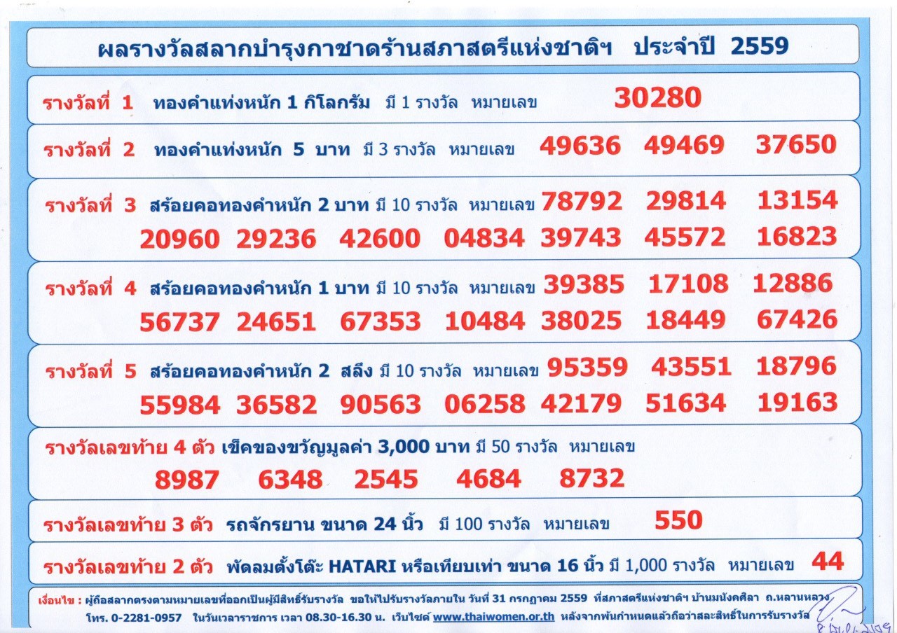 - ผลรางวัลสลากบำรุงกาชาด สภาสตรีแห่งชาติฯ ปี ๒๕๕๙