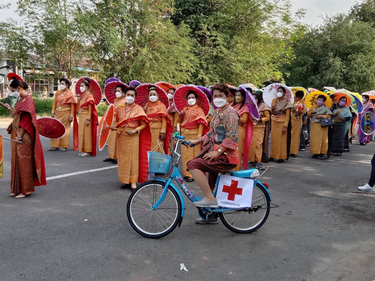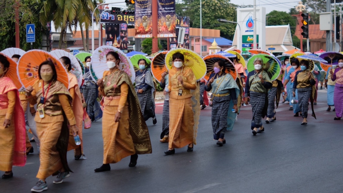 วันที่ ๑๗ ธันวาคม ๒๕๖๔ เวลา ๑๔.๔๕ นางพรทิพย์ ตั้งกีรติ นายกสมาคมกองทุนสวัสดิการเพื่อสตรี จังหวัดพระนครศรีอยุธยา และ นางมุกดา ธิษณ์ธนากร นายกสมาคมสตรีศรีอยุธยา องค์กรสมาชิกสภาสตรีแห่งชาติฯ นำคณะกรรมการองค์กร ห่มสไบ สวมใส่ผ้าไทยลายขอ กางร่มโบราณ จำนวน ๖๐ คน เข้าร่วมเดินริ้วขบวนเปิดงาน “ยอยศยิ่งฟ้าอยุธยามรดกโลก ประจำปี พ.ศ.๒๕๖๔