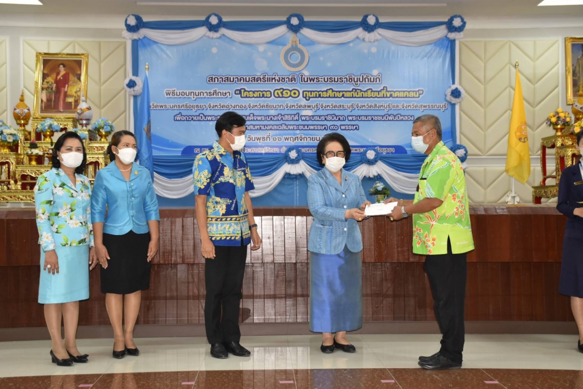 วันพุธที่ ๑๖ พฤศจิกายน ๒๕๖๕ เวลา ๑๓.๐๐ น. นางสาวสุกัญญา ประจวบเหมาะ ประธานสภาสมาคมสตรีแห่งชาติ ในบรมราชินูปถัมภ์ เป็นประธานในพิธีมอบทุนการศึกษา โครงการ “๙๑๐ ทุนการศึกษาแก่นักเรียนที่ขาดแคลน” ครั้งที่ ๕ ถวายเป็นพระราชกุศล สมเด็จพระนางเจ้าสิริกิติ์ พระบรมราชินีนาถ พระบรมราชชนนีพันปีหลวง ในโอกาสมหามงคลเฉลิมพระชนมพรรษา ๙๐ พรรษา ในพื้นที่ภาคกลาง จำนวน ๗ จังหวัด จำนวน ๑๑๐ ทุนการศึกษา ทุนละ ๓,๐๐๐ บาท เป็นเงินจำนวน ๓๓๓,๐๐๐ บาท ประกอบด้วยจังหวัดพระนครศรีอยุธยา อ่างทอง ชัยนาท ลพบุรี สระบุรี สิงห์บุรี และสุพรรณบุรี โดยมี รองประธานสภาสมาคมสตรีแห่งชาติฯ ประกอบด้วย ดร.ฉันทนา เปียทอง ดร.ณ ฤดี เคียงศิริ พร้อมด้วย คณะกรรมการอำนวยการ คณะกรรมการบริหาร และนางสาวเบญจมาศ รุจิรวงศ์ ประธานสมาชิกสมทบสภาสตรีแห่งชาติฯ และนางวัชราภรณ์ รุ่งสาคร นายกเหล่ากาชาดจังหวัด หัวหน้าส่วนราชการในพระนครศรีอยุธยา และองค์กรสมาชิกสภาสมาคมสตรีแห่งชาติ เข้าร่วมในพิธี