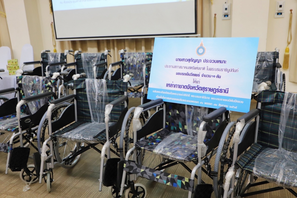 ในโอกาสนี้ นางสาวสุกัญญา ประจวบเหมาะ ประธานสภาสมาคมสตรีแห่งชาติฯ และนางรชตภร โตดิลกเวชช์ ที่ปรึกษาประธานสภาสมาคมสตรีแห่งชาติ ได้ มอบรถเข็นวีลแชร์เพจำนวน ๑๐ คันให้นายวิชวุทย์ จินโต ผู้ว่าราชการจังหวัดสุราษฎร์ธานี เพื่อร่วมสนับสนุนโครงการ “รถเข็นนั่ง ปันสุข” จังหวัดสุราษฎร์ธานี เฉลิมพระเกียรติสมเด็จพระนางเจ้าสิริกิติ์ พระบรมราชินีนาถ พระบรมราชชนนีพันปีหลวง เนื่องในโอกาสมหามงคลเฉลิมพระชนมพรรษา ๙๐ พรรษา ๑๒ สิงหาคม ๒๕๖๕