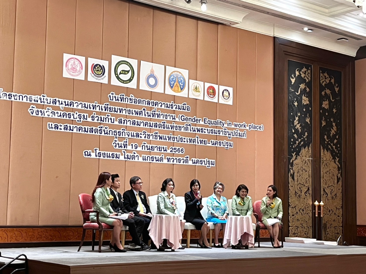 นางสาวณัฏฐ์ปภาณ จันทร์ละมูล นายกสมาคมสตรีนักธุรกิจและวิชาชีพแห่งประเทศไทย – นครปฐม/ กรรมการอำนวยการสภาสมาคมสตรีแห่งชาติฯ กล่าวว่า สมาคมสตรีนักธุรกิจและวิชาชีพแห่งประเทศไทย-นครปฐม เป็นหนึ่งในองค์กรสมาชิกของสภาสมาคมสตรีแห่งชาติในพระบรมราชินูปถัมภ์ ได้สนับสนุนให้จัดโครงการสนับสนุนความเท่าเทียมทางเพศในที่ทำงาน (Gender Equality in workplace) เพื่อสร้างความตระหนักรู้และการยอมรับความแตกต่างด้านเพศภาวะ รวมถึงเพิ่มบทบาทของผู้ประกอบการการสตรีในสถานประกอบการจังหวัดนครปฐม ตลอดจนสร้างกระแสสังคมให้เห็นศักยภาพของทุกคนที่แตกต่างกันโดยการสนับสนุนความเท่าเทียมทางเพศ และสนับสนุนการดูแลเรื่องสวัสดิการให้แก่กลุ่มเปราะบางในพื้นที่ การดำเนินโครงการดังกล่าวสมาคมสตรีนักธุรกิจและวิชาชีพแห่งประเทศไทย-นครปฐม นครปฐม ได้บูรณาการหน่วยงานภาครัฐและเอกชนประกอบด้วย สำนักงานสวัสดิการและคุ้มครองแรงงานจังหวัด สรรหาผู้ประกอบการที่ได้รับมาตรฐานแรงงานไทย จำนวน ๓๒ แห่ง สำนักงานสำนักงานพัฒนาชุมชนจังหวัด สรรหากลุ่มวิสาหกิจชุมชนและกลุ่มแม่บ้านสตรี รวมจำนวน ๗ องค์กร และหน่วยงานสังกัดกระทรวงการพัฒนาสังคมและความมั่นคงของมนุษย์ ๔ หน่วยงาน
