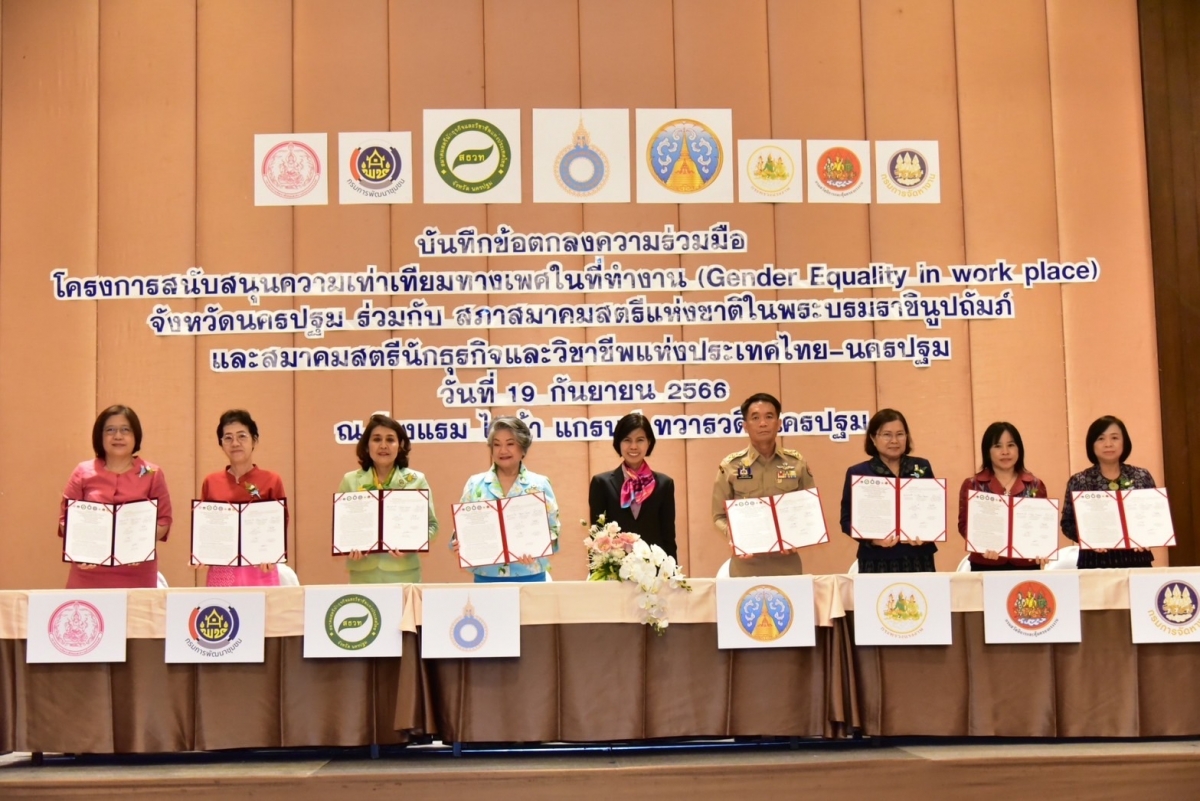 วันอังคารที่ ๑๙ กันยายน ๒๕๖๖ เวลา ๑๓.๓๐ น. ณ โรงแรมไมด้า แกรนด์ ทวารวดี อำเภอเมืองนครปฐม จังหวัดนครปฐม นายยงยุทธ สวนทอง รองผู้ว่าราชการจังหวัดนครปฐม เป็นประธานในพิธีลงนามบันทึกข้อตกลงความร่วมมือโครงการสนับสนุนความเท่าเทียมทางเพศ ในที่ทำงาน โดยมี นางสาวสุกัญญา ประจวบเหมาะ ประธานสภาสมาคมสตรีแห่งชาติ ในพระบรมราชินูปถัมภ์ นางจินตนา จันทร์บำรุง อธิบดีกรมกิจการสตรีและสถาบันครอบครัว กระทรวงการพัฒนาสังคมและความมั่นคงของมนุษย์ นางเยาวเรศ ชินวัตร ที่ปรึกษาสภาสมาคมสตรีแห่งชาติ ในพระบรมราชินูปถัมภ์นางวราภรณ์ เจริญศิริโชติ นายกเหล่ากาชาดจังหวัดนครปฐม นางสาวณัฏฐ์ปภาณ จันทร์ละมูล นายกสมาคมสตรีนักธุรกิจและวิชาชีพแห่งประเทศไทย – นครปฐม/กรรมการอำนวยการสภาสมาคมสตรีแห่งชาติฯ นางสาวยุพิน มูลจันทะ แรงงานจังหวัด ผู้แทน สนง.สวัสดิการและคุ้มครองแรงงานจังหวัด นางอัธยา อ่ำหนองโพ จัดหางานจังหวัด ,นางสาวทิพวรรณ ไชยูปถัมภ์ พัฒนาการจังหวัด และนางสาวศิริพร โรจนสุกาญจน พัฒนาสังคมและความมั่นคงของมนุษย์จังหวัด ร่วมพิธีลงนาม บันทึกความร่วมมือโครงการสนับสนุนความเท่าเทียมทางเพศในที่ทำงาน (Gender Equality in workplace)